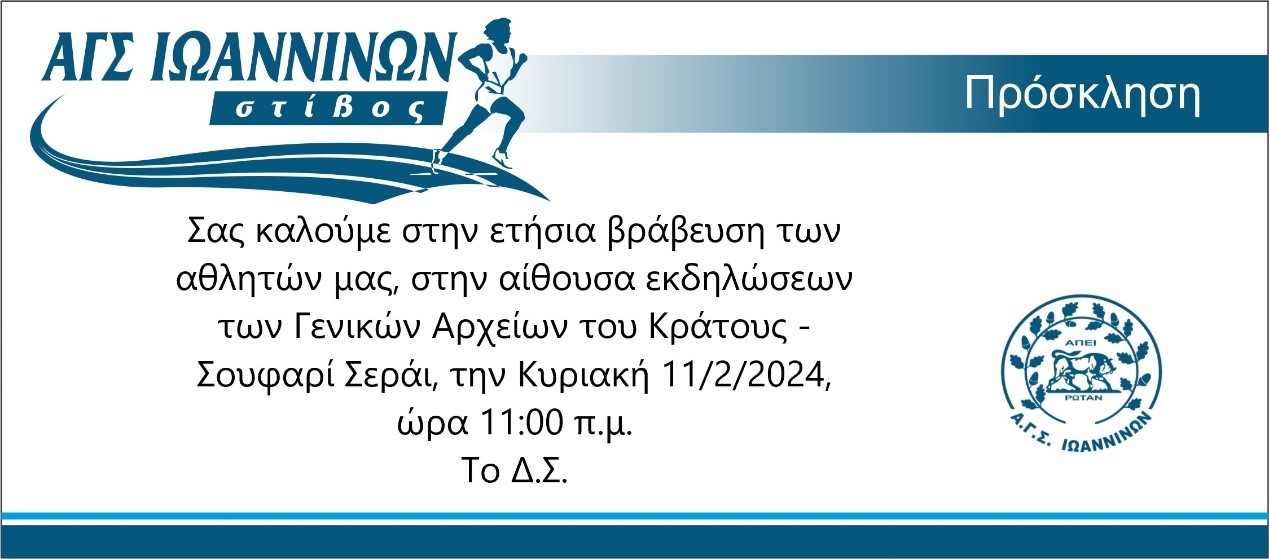 Τα Γενικά Αρχεία του Κράτους- Ιστορικό Αρχείο Μουσείο Ηπείρου θα φιλοξενήσουν την τελετή βράβευσης, που διοργανώνει ο ΑΓΣΙωαννίνων-Στίβος, προς τιμήν των αθλητών-αθλητριών του που διακρίθηκαν...